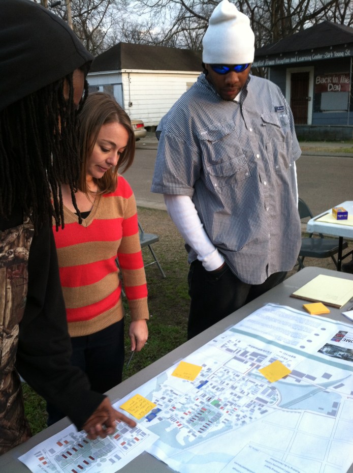 In addition to productive conversations throughout the evening, residents wrote comments on post-it notes sharing their opinions. This feedback helped clarify the locations to pursue for construction of the community center and the gathering space. Less clear, was the contentious conversation over two initial proposals for a neighborhood logo. More work, and significantly more feedback from Baptist Town residents, will be required before a decision can be reached.