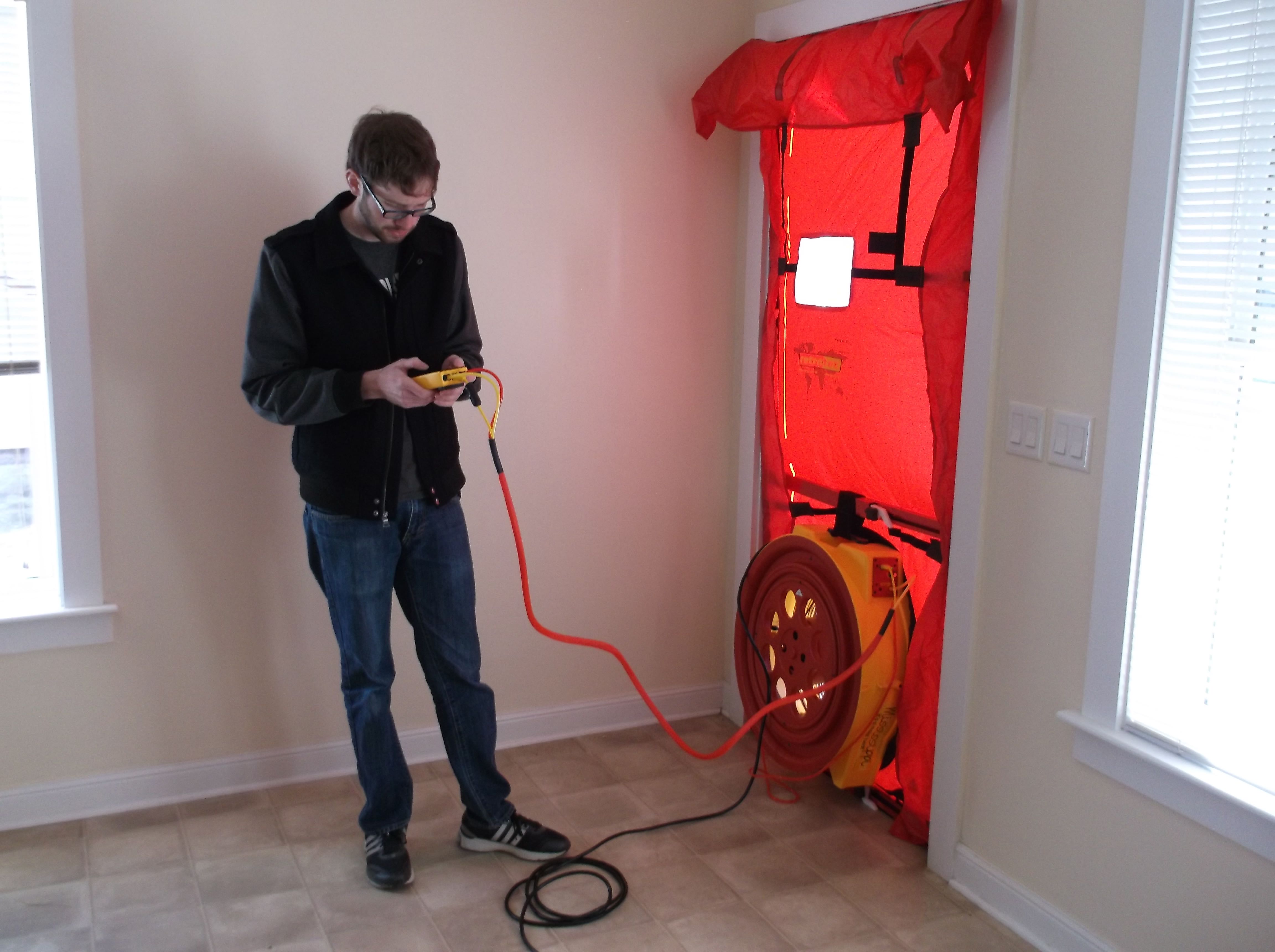 An MSU student tests air infiltration rates in one of the Baptist Town Cottages in November 2014.